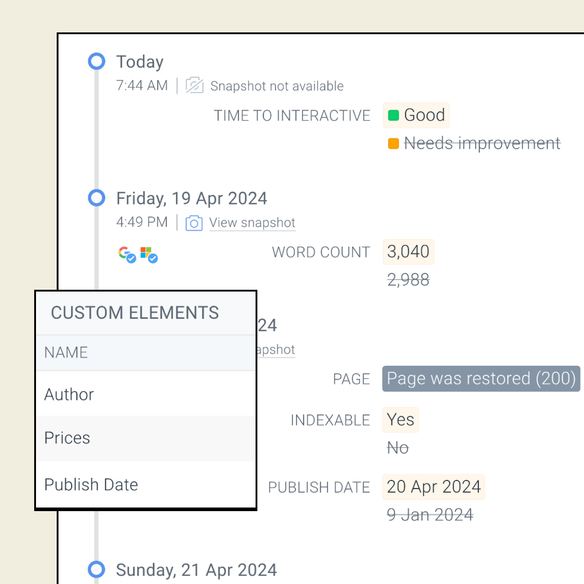 Build fully custom rules to monitor and track any page element across your website to easily manage content, product pages, brand standards, and legal compliance. Plus, access a full changelog and set up proactive alerts so you're never left in the dark.