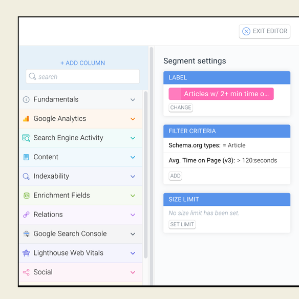 Guard website health and minimize risks during migrations or major campaigns with custom monitoring for any dimension of your site. Create rule-based segments using any criteria combinations, from on-page elements to core web vitals.