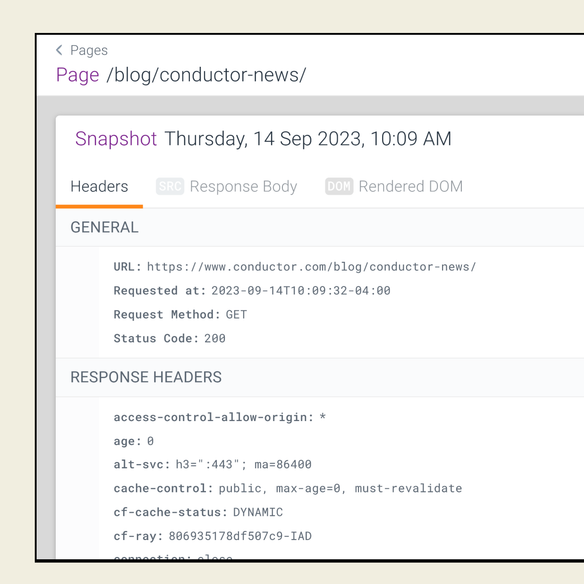 Explore the entire response payload for any change with HTTP request and response headers, response body, and rendered DOM snapshots instantly available. Easily troubleshoot the root cause of issues with just one click.