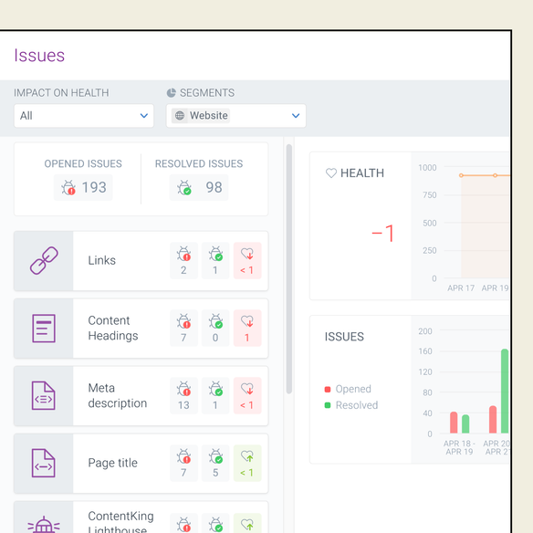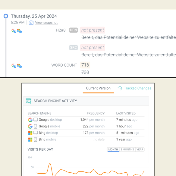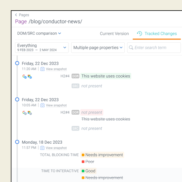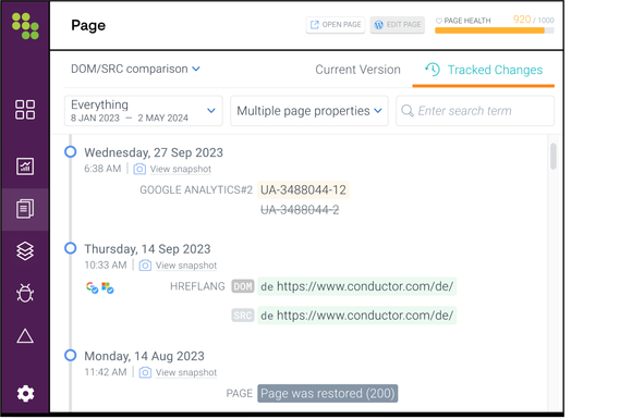 Learn why changes occurred and quickly trace the origin with a complete changelog showing updates to page titles, meta descriptions, hreflang implementation, and everything else.