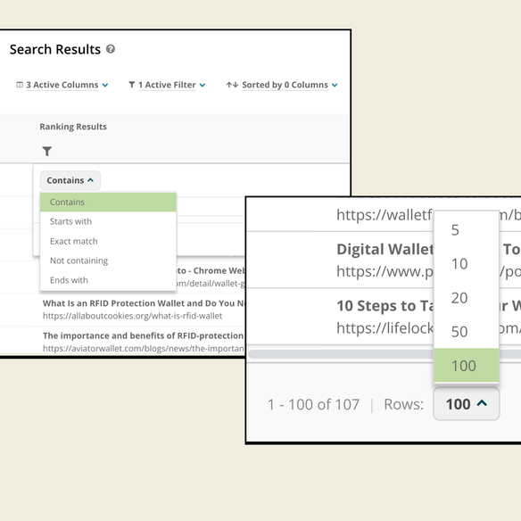 See the top 100 SERP results you’re competing against for any term. Filter the list by phase or brand name then select any page to kick off research.