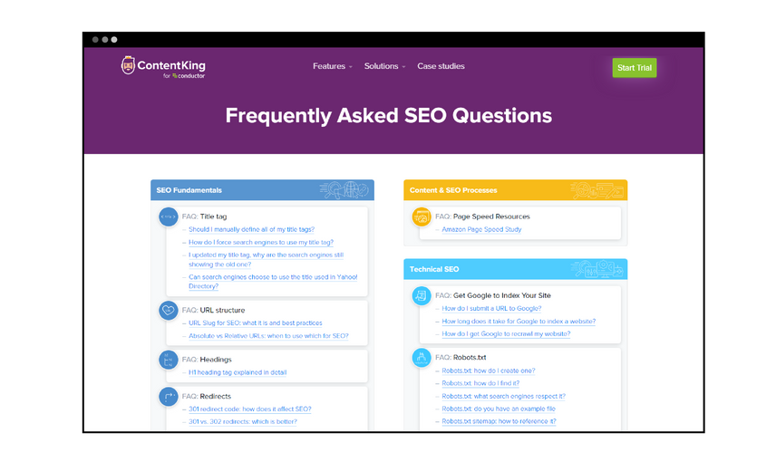 - ContentKing’s Frequently Asked SEO Question Hub: ContentKing answers the most-asked questions ranging from technical SEO to Google Search Console, SEO reporting, and more in this comprehensive piece. This is a great educational resource to use when you’re looking for quick SEO insights and answers.