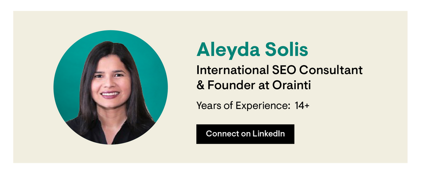 Aleyda Solís is a well-known and experienced international SEO consultant, author, and speaker, with over 14+ years of SEO experience in European, American, and Latin-American companies. She is the founder of Orainti—a highly specialized boutique SEO agency—and has been a featured speaker at over 100 marketing conferences across 20 different countries, including Women in Tech SEO.