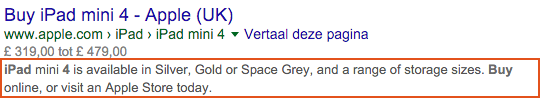 When it comes to meta descriptions it's important to ask a visitor to take action. Take another look at the Apple iPad 4 mini example: "Buy online, or visit an Apple store today". People are told to buy the iPad 4 online, or either go to a physical store to make the purchase. Today. That's a pretty good CTA right there.