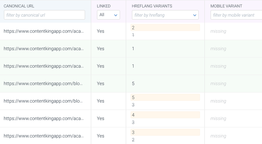 - Indexability: pages for which the indexability status has changed; changes to link relations such as the hreflang attribute, mobile attribute, pagination attributes, and AMP.
