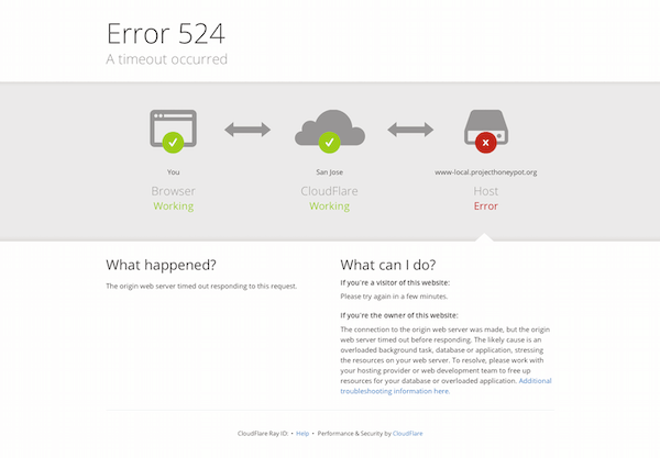 The HTTP status code 524 doesn't officially exist. It was made up by Cloudflare and is sent when the request's origin times out. The issue isn't on Cloudflare's end; instead, the server that Cloudflare is relying on is the issue.