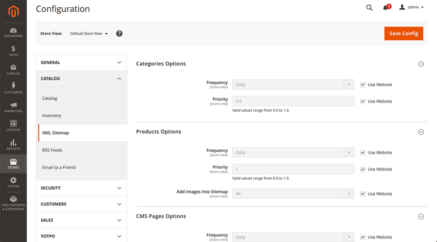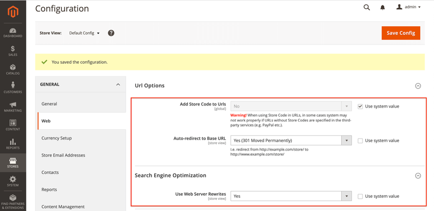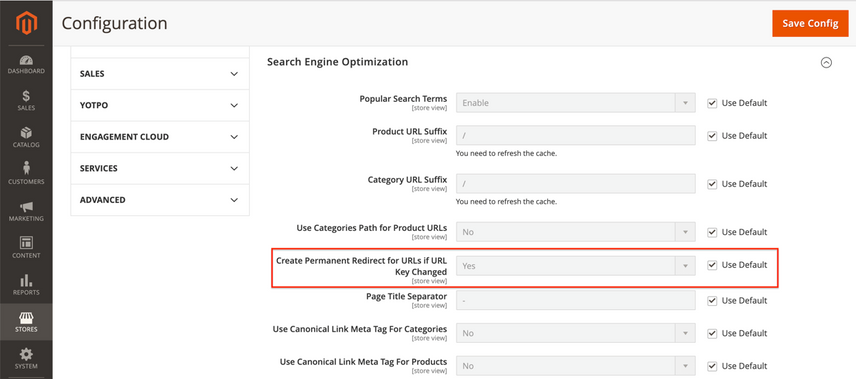 Auto-redirect to Base URLenables you to automatically redirect visitors and search engines when they request your store without the subdomain (e.g. whenhttps://www.example.comis requested, clients are forwarded tohttps://example.com), or vice versa. While this is a great feature, by default it’s configured to use a temporary 302 redirect instead of a 301 redirect. Change this value toYes (301 Moved Permanently)to make sure link authority from incorrectly placed links is passed on as much as possible to the right URL. - Under Search Engine Optimization you’ll find the field