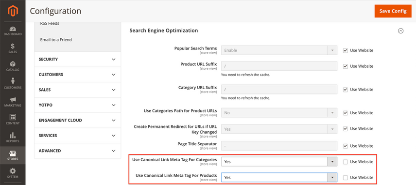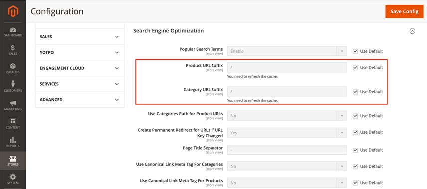 Stores>Configuration(underSettings) >Catalog>Catalog>Search Engine Optimization.- At the top of the page, select the right Store View you want to adjust the settings for. In our example this is