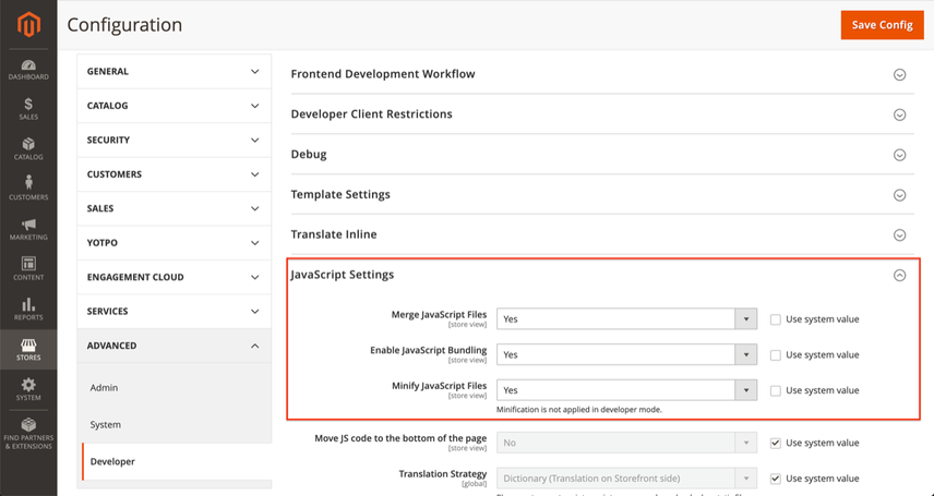Configure your store’s JavaScript settings by going to Stores > Configuration (under Settings) > Advanced > Developer.