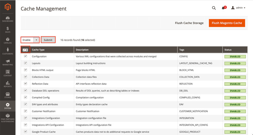 System>Cache Management - Mark all checkboxes, select