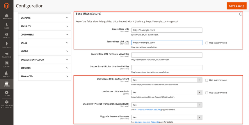Furthermore, change the value of the Use Secure URLs on Storefront, Use Secure URLs in Admin, Enable HTTP Strict Transport Security (HSTS) and Upgrade Insecure Requests fields to Yes.