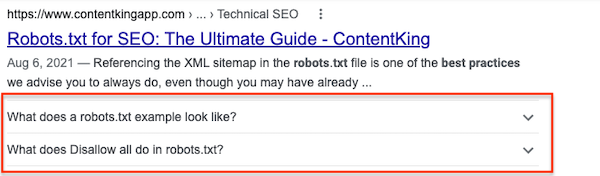 Here’s an example of FAQpage markup for our robots.txt guide, which is useful and gets quite some attention: