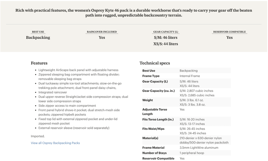 Cover the key features first. For example, with the Osprey Kyte 46 pack Women’s, REI highlights:
