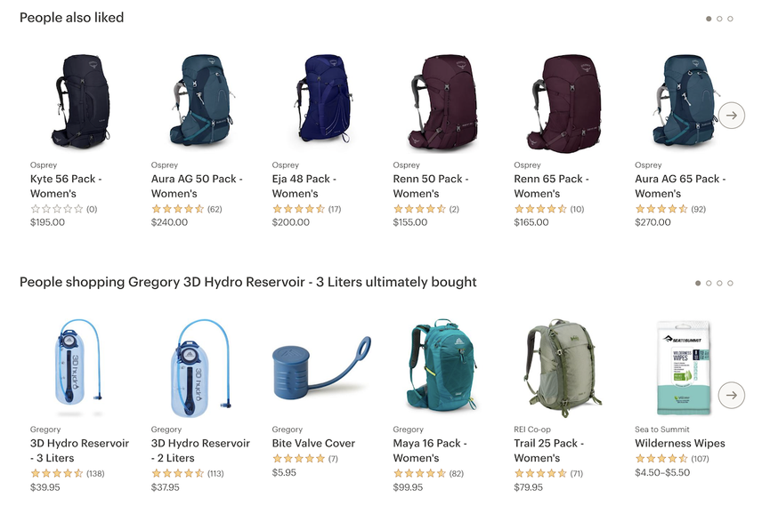We like REI’s approach (yes, we’re big fans), where they feature two types of related products: