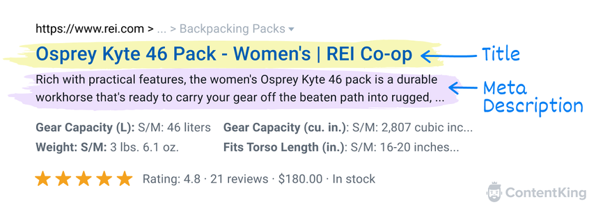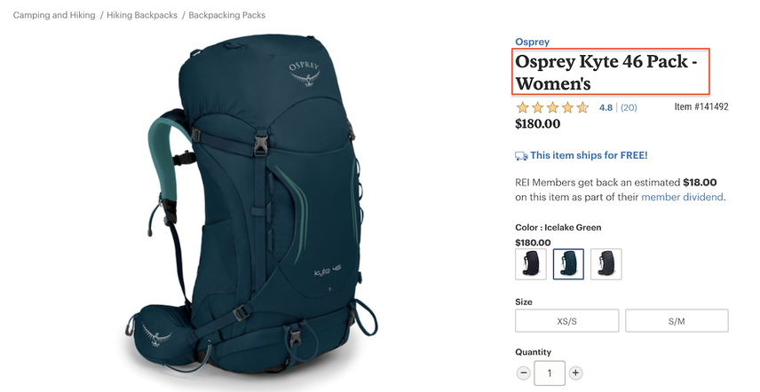 Let’s say you run an eCommerce store called “Into The Wild” that sells backpacks, and you want to rank for osprey kyte 46 pack women. For starters you’ll need to include those keywords in your product name, meta information, and URL. We’ll cover the meta information and URL in detail below, but let’s first focus on the product name.