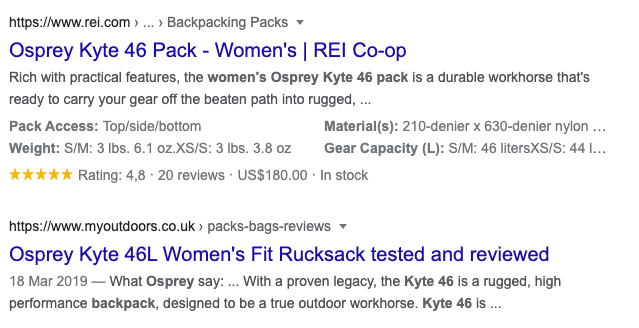 <script type="application/ld+json"> { "@context": "https://schema.org/", "@type": "Product", "name": "Kyte 46 Pack - Women's", "image": [ "https://example.com/photos/backpack-osprey-kyte-46-women-front.jpg", "https://example.com/photos/backpack-osprey-kyte-46-women-side.jpg", "https://example.com/photos/backpack-osprey-kyte-46-women-back.jpg" ], "description": "Rich with practical features, the women's Osprey Kyte 46 pack is a durable workhorse that's ready to carry your gear off the beaten path into rugged, unpredictable backcountry terrain.", "sku": "141492", "gtin13": "0845136079946", "brand": { "@type": "Brand", "name": "Osprey" }, "aggregateRating": { "@type": "AggregateRating", "ratingValue": "4.9", "reviewCount": "123" }, "offers": { "@type": "Offer", "url": "https://example.com/backpacks/hiking/osprey-kyte-46-pack-womens/", "priceCurrency": "USD", "price": "179.99", "priceValidUntil": "2021-08-25", "itemCondition": "https://schema.org/NewCondition", "availability": "https://schema.org/InStock" } } </script>