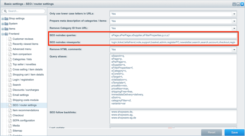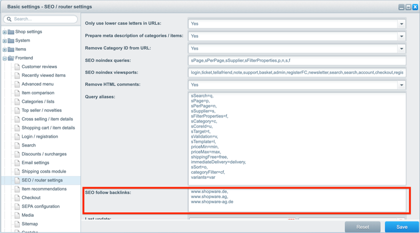Shopware automatically adds the nofollow link attribute to all links to external sites, unless they’re whitelisted using the SEO follow backlinks’ field (see screenshot below). In practice, this means that in a lot of cases, most links to external sites have the nofollow link attribute, sending the following message to search engines: “I do want to link to this other website, but I don’t trust them, so don’t credit them.”