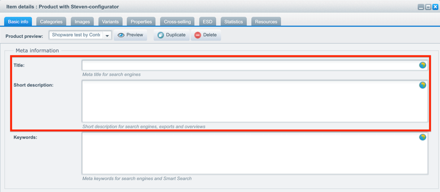 In several places, Shopware lets you enter meta keywords.