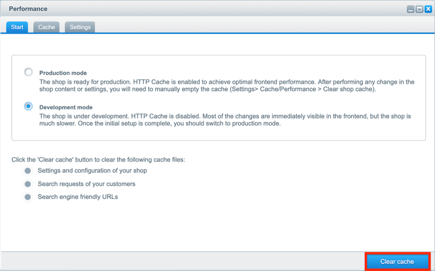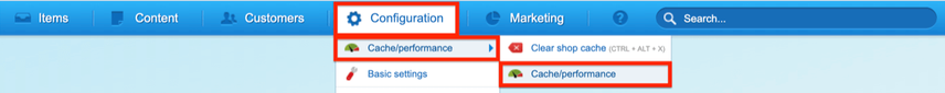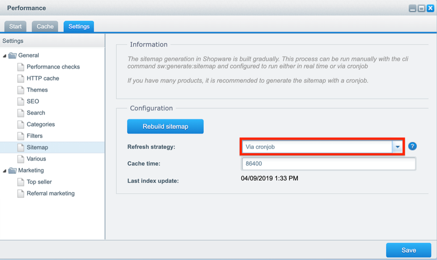 The only setting available in Shopware for the XML Sitemap is the one to define how it’s generated. To modify this, go to Configuration > Cache/performance and choose Cache/performance: