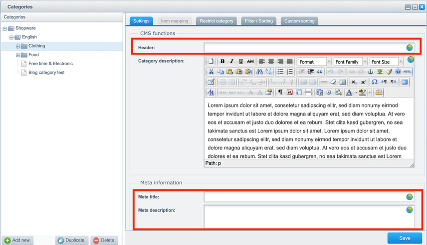 By default, the fields Header, Meta title and Meta description are empty. Filling in their values will overwrite the automatically generated values.