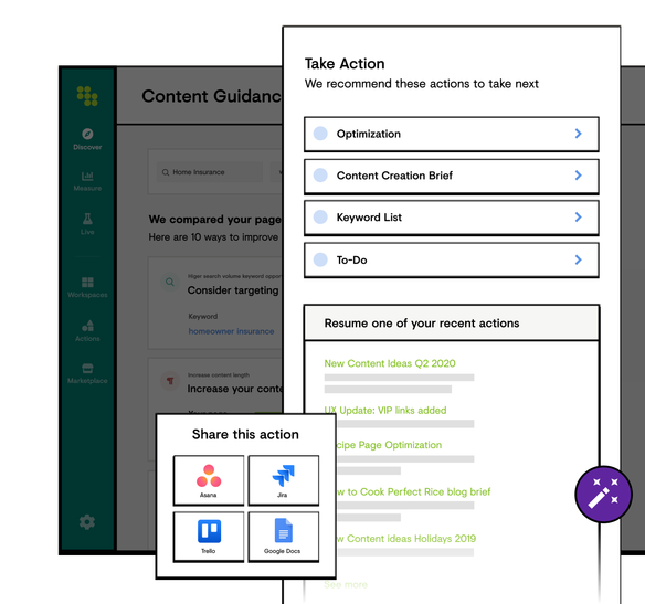 Von der Dateneinsicht direkt zur Umsetzung: Füge mit einem einzigen Klick wirkungsvolle Empfehlungen, Keywords, Beispiele von Mitbewerbern und vieles mehr zu Content und Optimierungs-Briefs hinzu, die du dann mit dem Task Manager (z. B. Asana, Trello und Jira) deines Teams teilen kannst.
