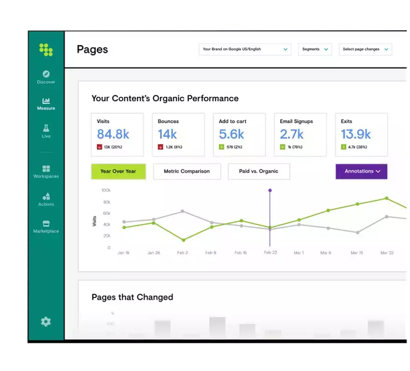 Miss die Performance deines Contents. So bekommst du einen guten Überblick darüber, wie deine Website Traffic, Umsatz und weitere SEO-KPIs aus der organischen Suche ankurbelt. Dies ist in deine Webanalyse integriert, um die kanalübergreifende Wirkung zu zeigen.
