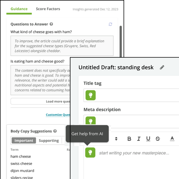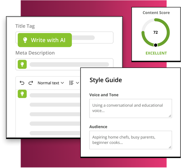 Generate high-quality, on-brand content drafts in seconds based on real-time search insights, competitor data, and your content performance goals—no training required.