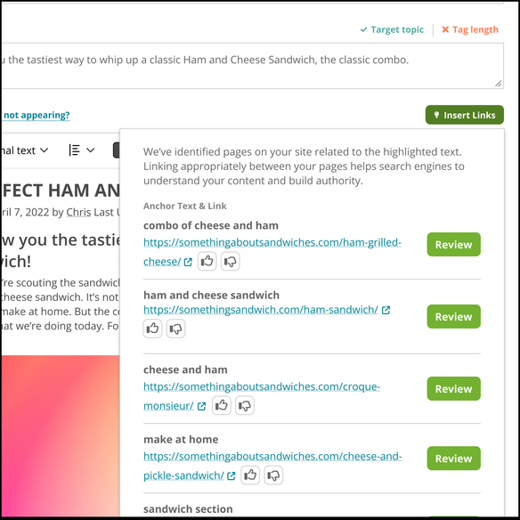 Our AI automatically suggests the best internal links based on site structure, contextual relevance, and more—while you write—making it easy to improve discoverability and authority.