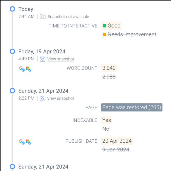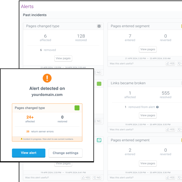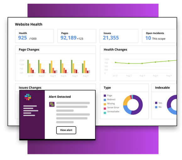 With customizable, real-time alerting, you don’t have to wait for a crawl to know if any changes or issues occur; you can fix problems and maintain compliance before your AI and search visibility, traffic, conversions, and revenue get impacted.