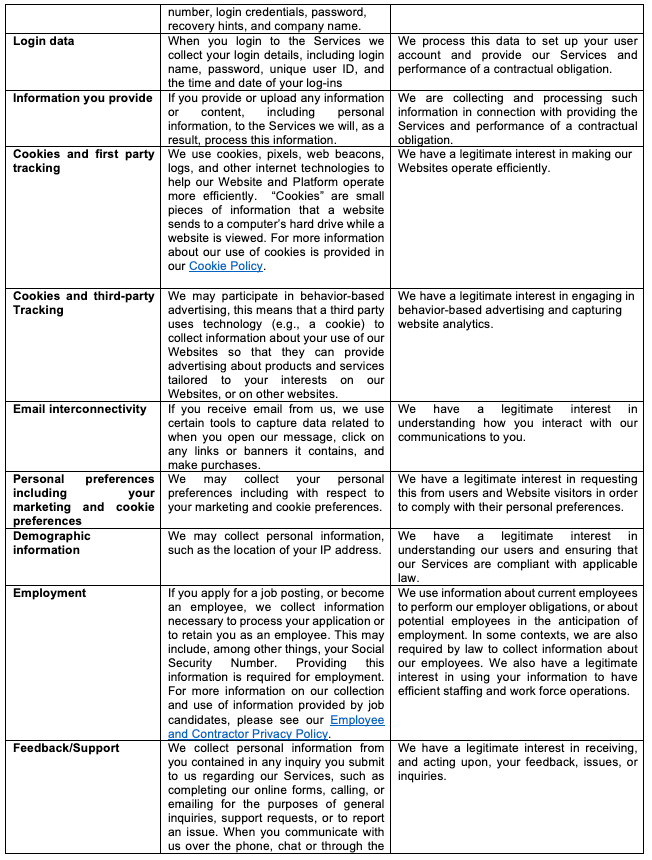 In order to provide you with our Services, we will process your personal data to set up your user account and process information each time you log-in.