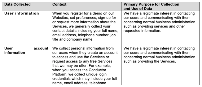 - Third party service providers processing personal data on Conductor's behalf, for example, to host, manage and service our data, distribute emails, research and analysis and administering certain services and features.