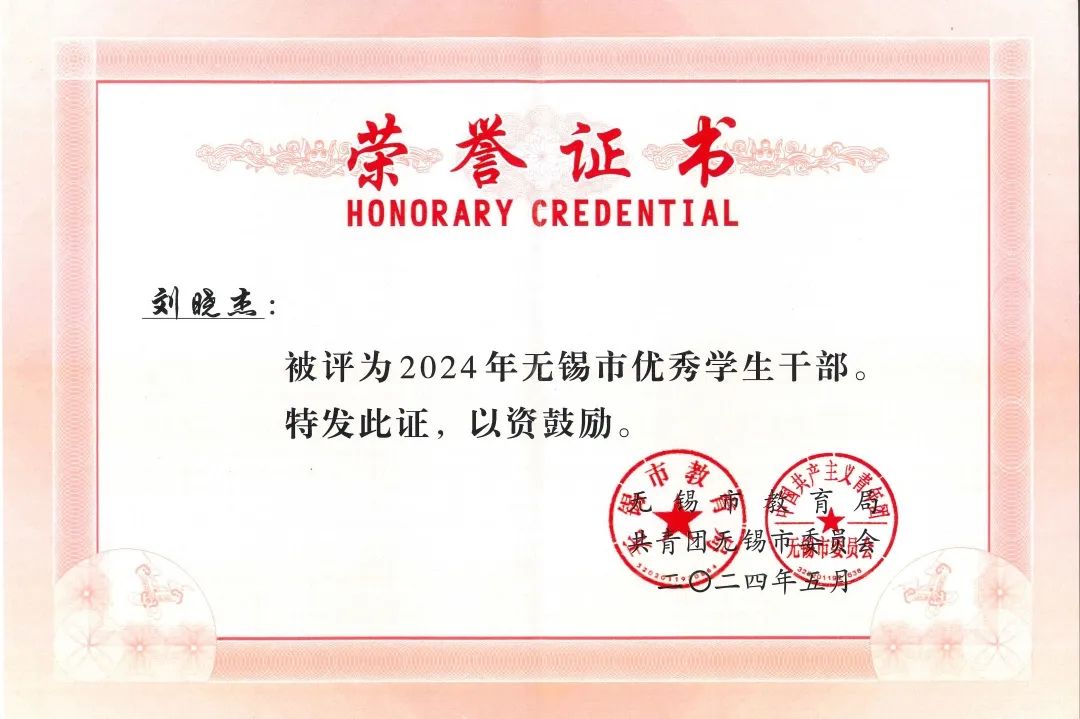 刘晓杰,汉族,中共党员,担任兼职辅导员、轻化2101班团支书、至善2203班班长、轻化2401班副班主任,目前已保研至浙江大学。学习刻苦勤勉,累积获得桑麻一等奖学金等13余项奖学金,累计金额达7.5w +,先后获评伟德bv国际体育十佳大学生、bevictor伟德官网年度人物。他积极投身科研竞赛,以团队负责人的身份主持一项国家级大创,在此期间,参与发表三篇SCI论文,并以第一作者在《Surfaces and Interfaces》期刊上发表一篇论文,参与申请三项中国发明专利,两项已进入实质审查,获得8项省级及以上科创竞赛奖项,该项目也以优秀结题;他关心同学,对待学生工作一丝不苟,先后获评“无锡市优秀学生干部”等荣誉称号;积极投身志愿活动,先后获评“至善学院尚行之星”、“无锡马拉松优秀志愿者”等荣誉称号。